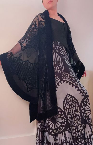 - Black sheer mesh & velvet kimono robe with cathedral motifs