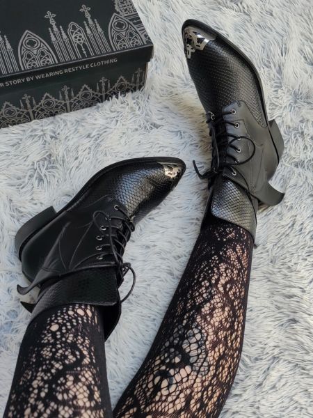 The Shadow Wing Pikes are bold, sculptural, and unapologetically goth. Made from contrasting snakeskin-effect and smooth PU leather, these low heel gothic pikes feature dramatic 3D bat wings that curve from the ankle. A custom cathedral-style metal toe cap adds sharp elegance, finished in antique silver.