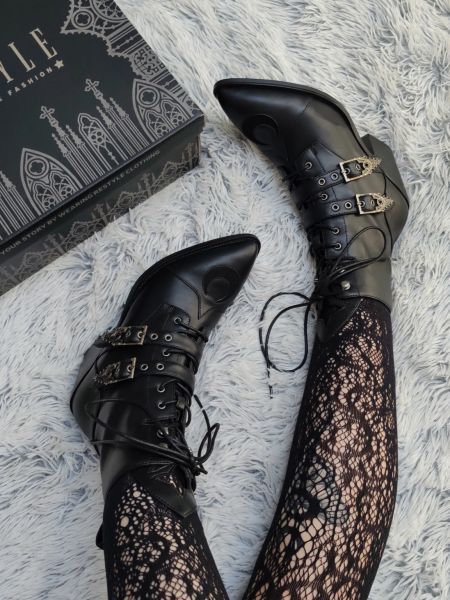 - Low-heeled gothic ankle boots with cathedral cut-outs, spire buckle straps, moon detail at toe, and two lacing styles — structured, versatile, and timeless.