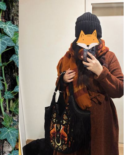 A witchy fox bag glowing with ember tones, born from the meeting of moonlight, fire, and forest shadows. This fox embroidery shoulder bag is inspired by dark fairytales and forest enchantment. Made for those who carry a little moonlight in their hearts.