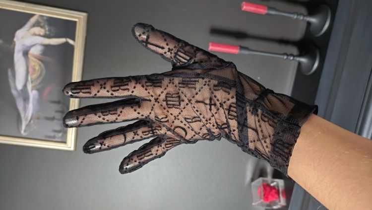 Gotyckie, siatkowane rękawiczki z logowanym monogramem dodadzą szyku każdej stylizacji. Uszyte z komfortowej siateczki z czarnym, aksamitnym wzorem projektu Restyle. Na wzór składają się logowania Restyle, księzyce i krzyże.