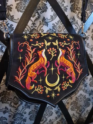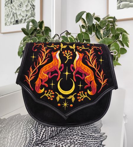 Ta zamszowa torba z haftowanym lisem łączy leśny, magiczny styl z nutą gotyckiej elegancji – idealna dla współczesnych wiedźm, marzycielek i wolnych dusz wędrujących w świetle księżyca. Zabierz swoje zwierzę mocy ze sobą.